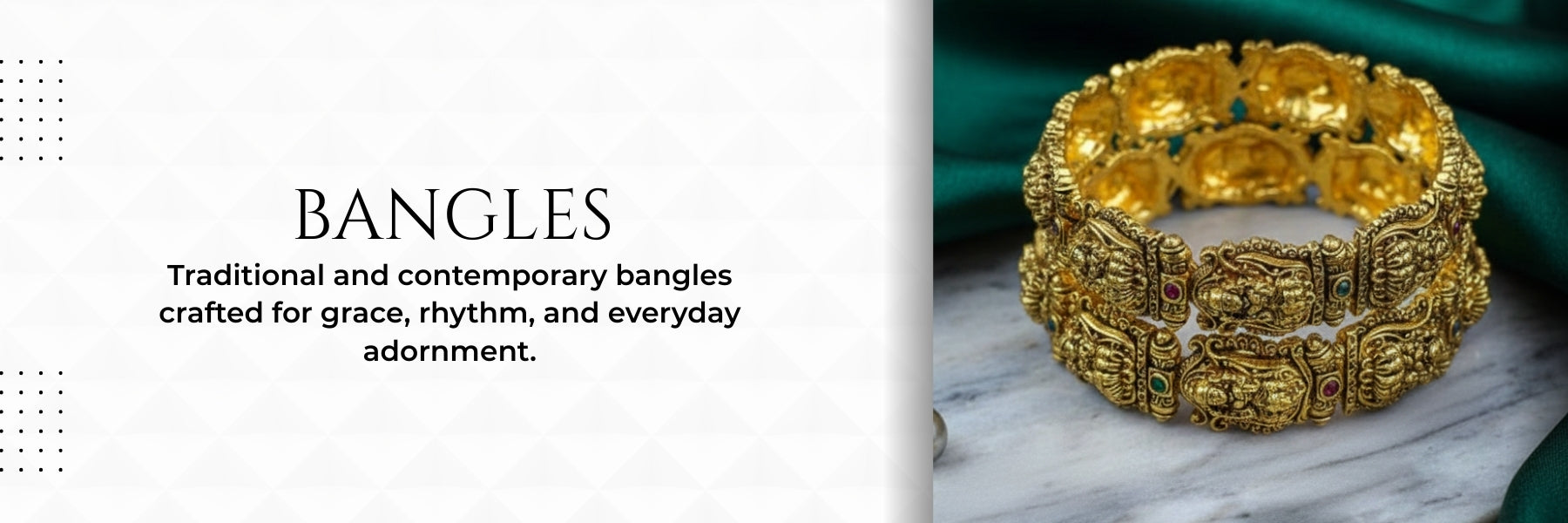Our bangles and bracelets collection blends traditional charm with modern elegance. Featuring temple-inspired bangles, gemstone-studded designs, and contemporary bracelets, each piece is crafted to add grace and rhythm to your style. Ideal for festive wear, weddings, and everyday adornment, these designs reflect timeless Indian craftsmanship.