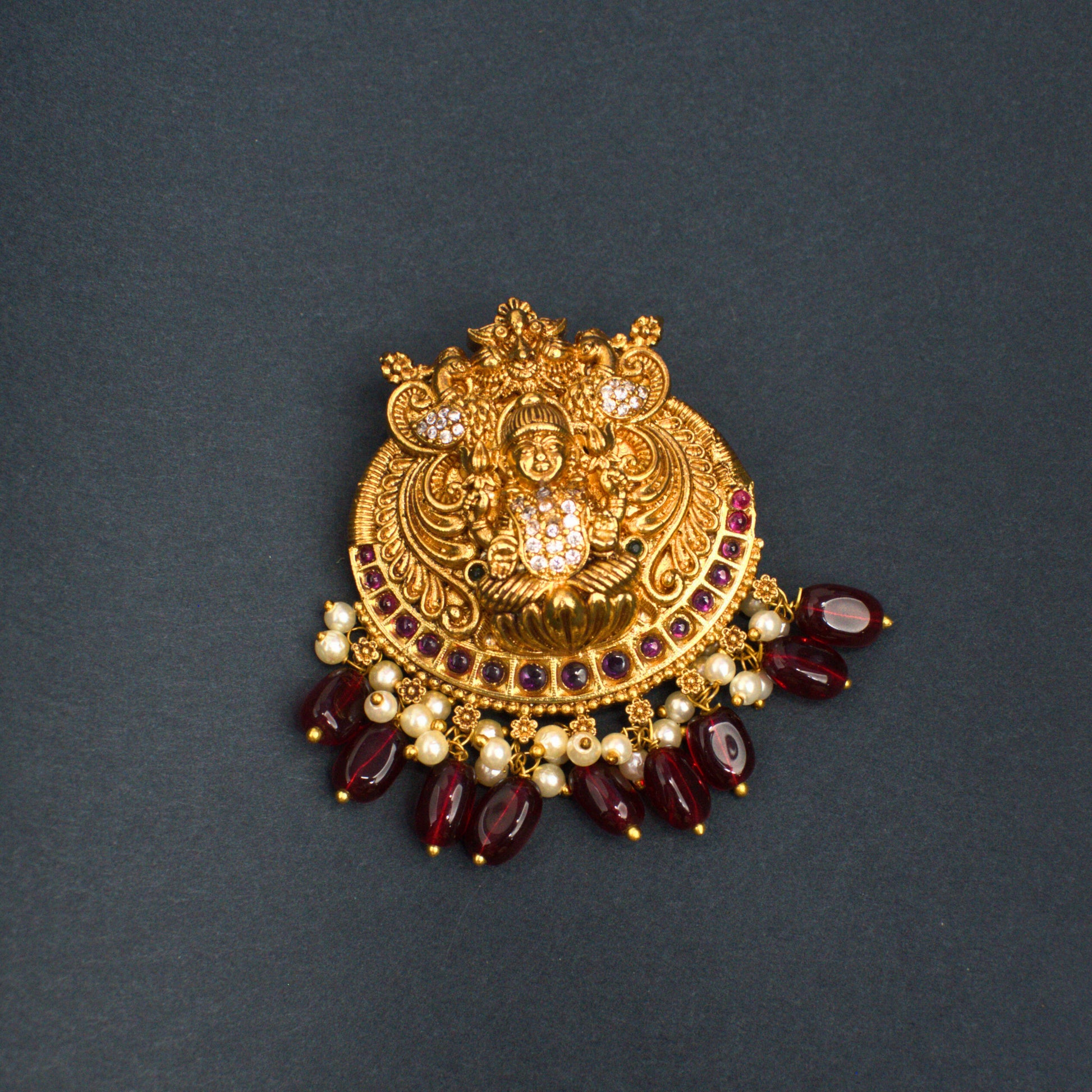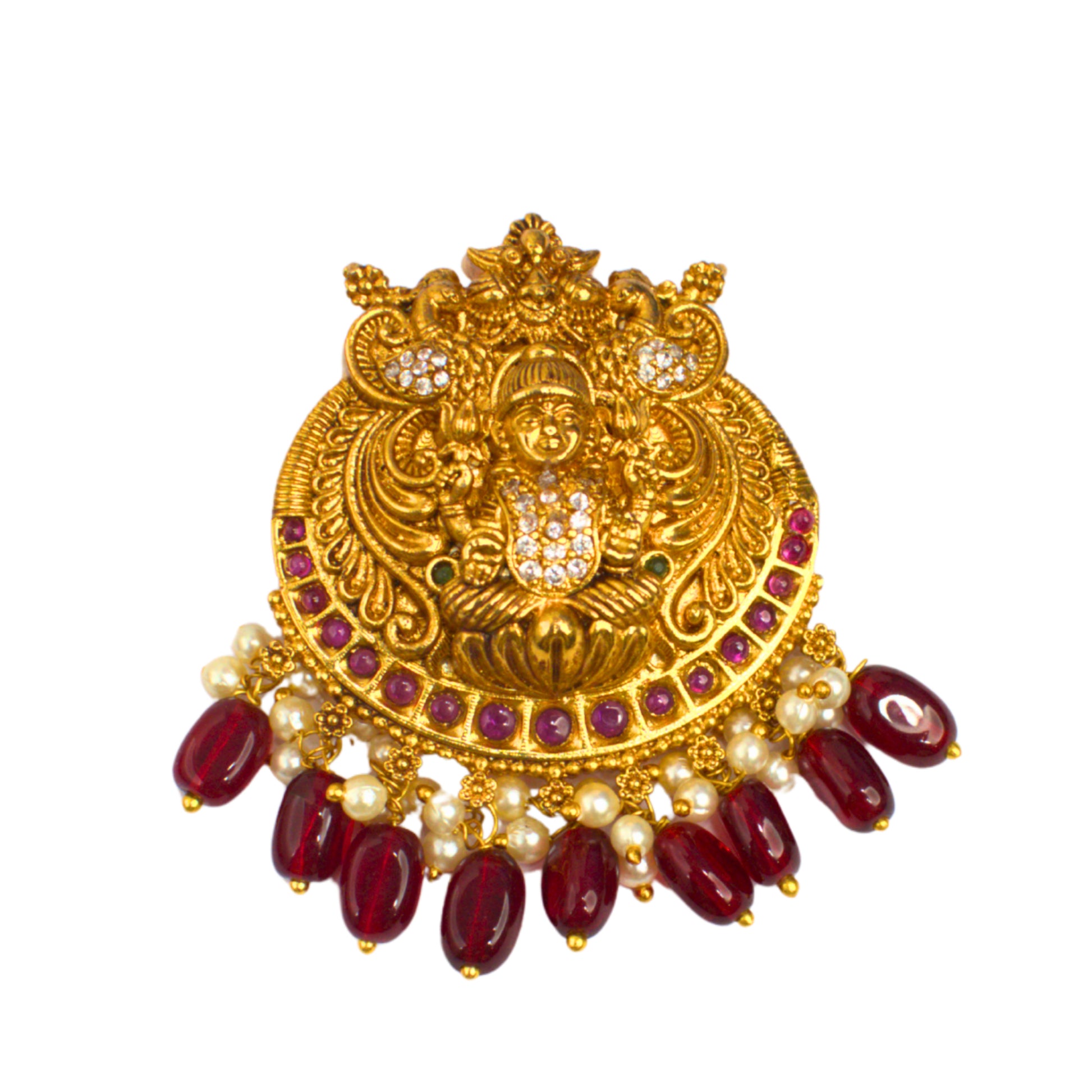 Udbhava Antique Gold Nakshi Lakshmi Temple Pendant with Red Beads & Pearls
