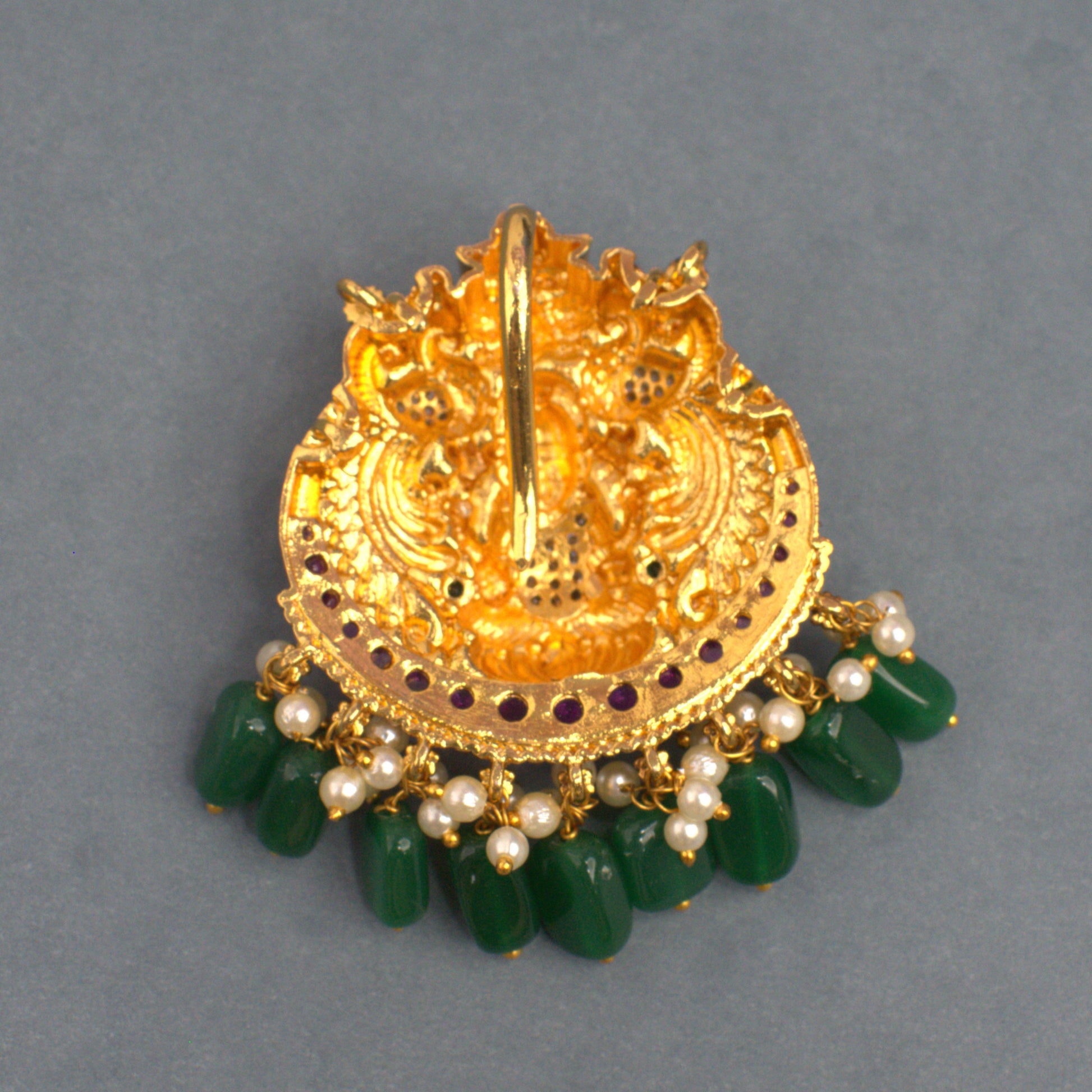 Udbhava Nakshi Lakshmi Temple Pendant in Antique Gold Finish with Green Onyx Bead Drops