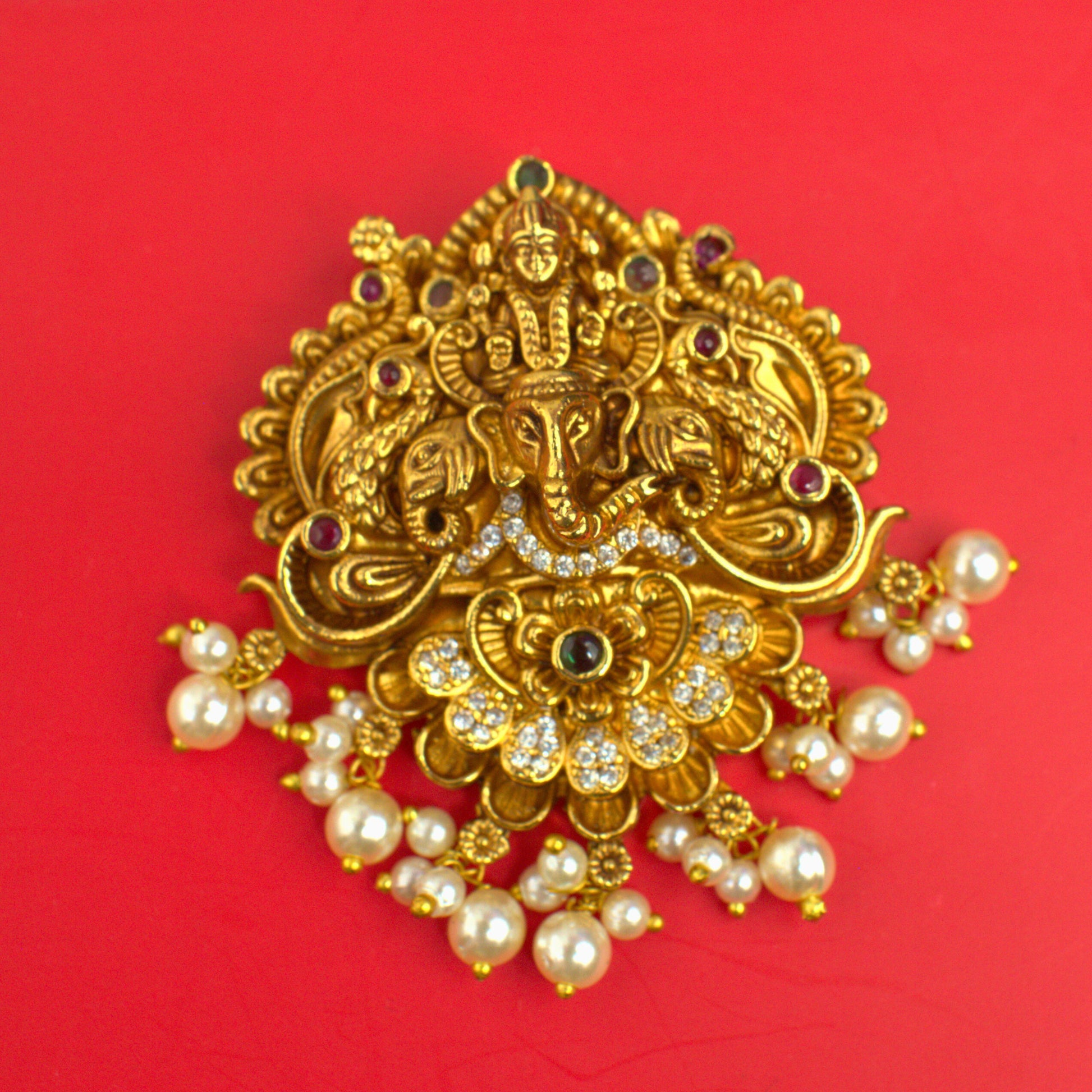 Udbhava Nakshi Ganesha Temple Pendant in Antique Gold Finish with Pearl Drops