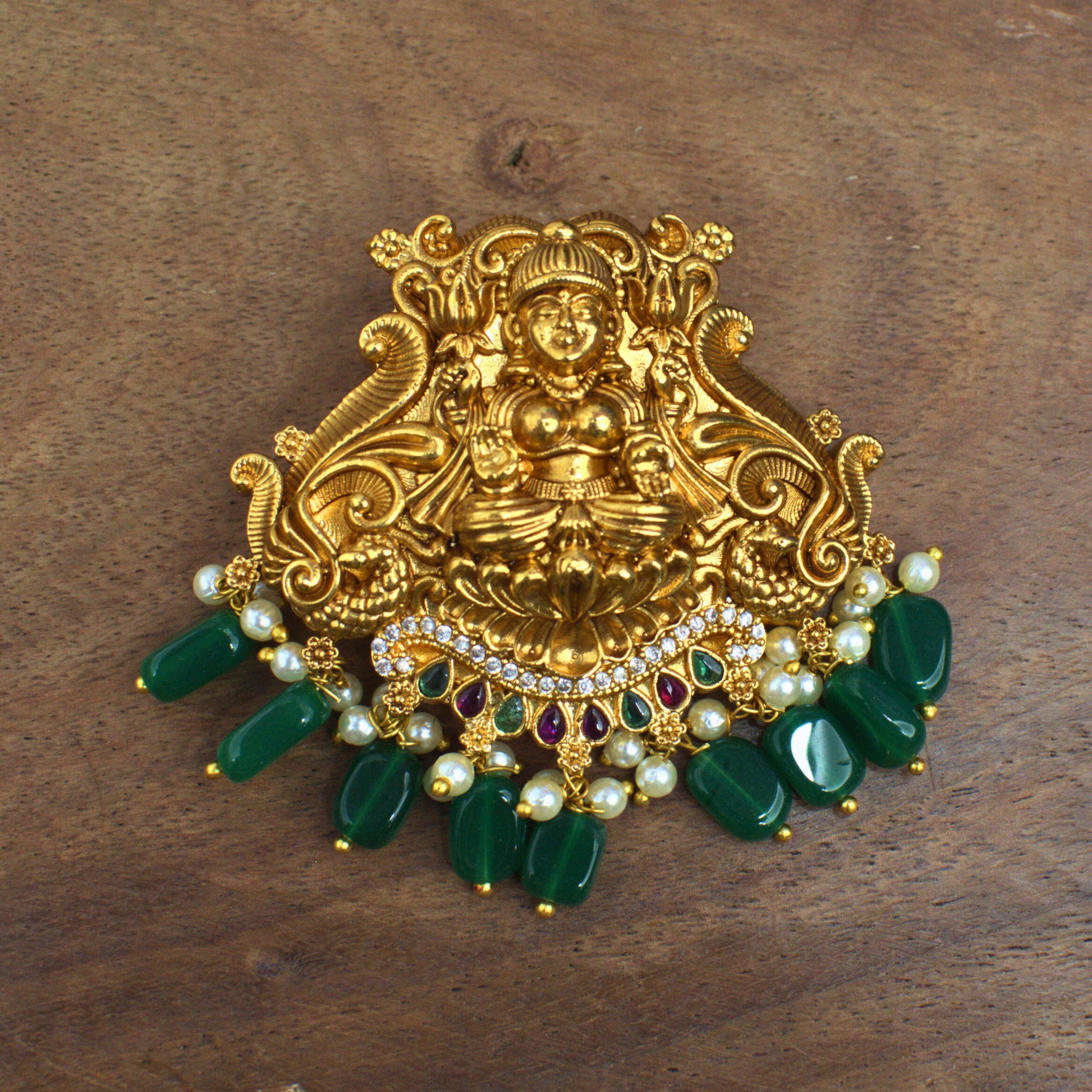 Udbhava Nakshi Lakshmi Temple Pendant in Antique Gold Finish with Green Bead Drops