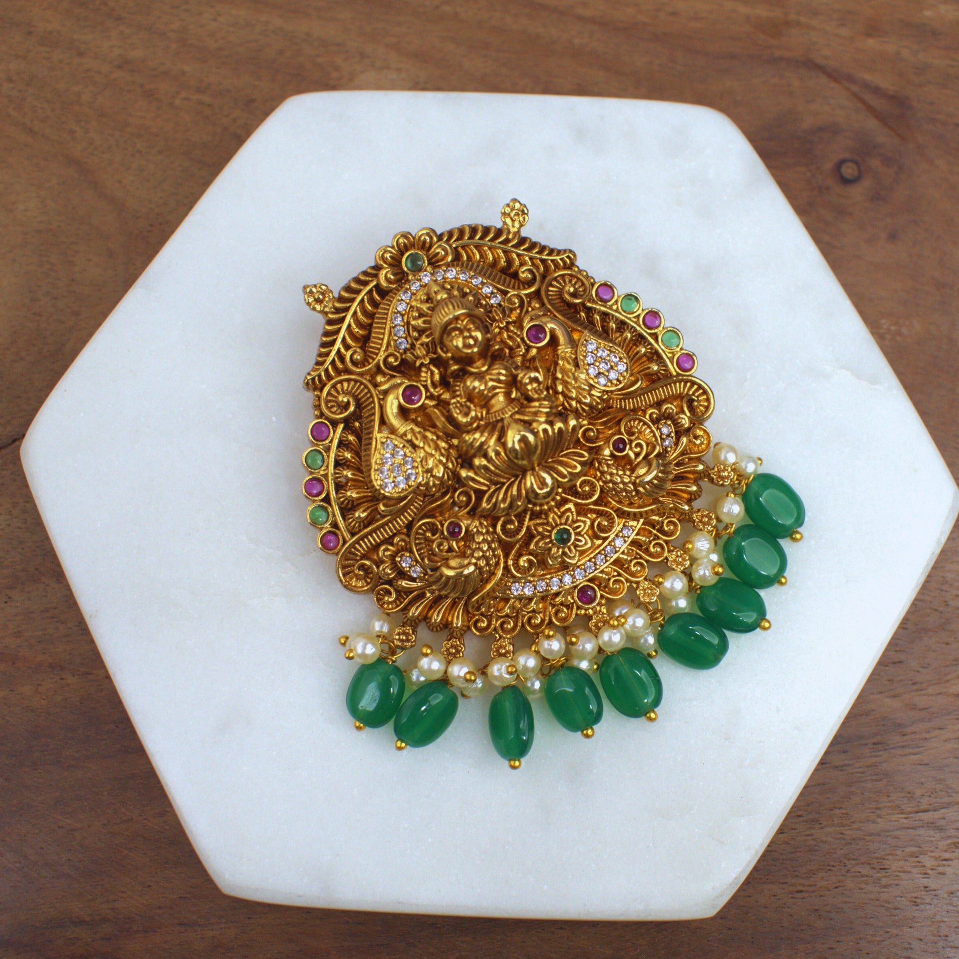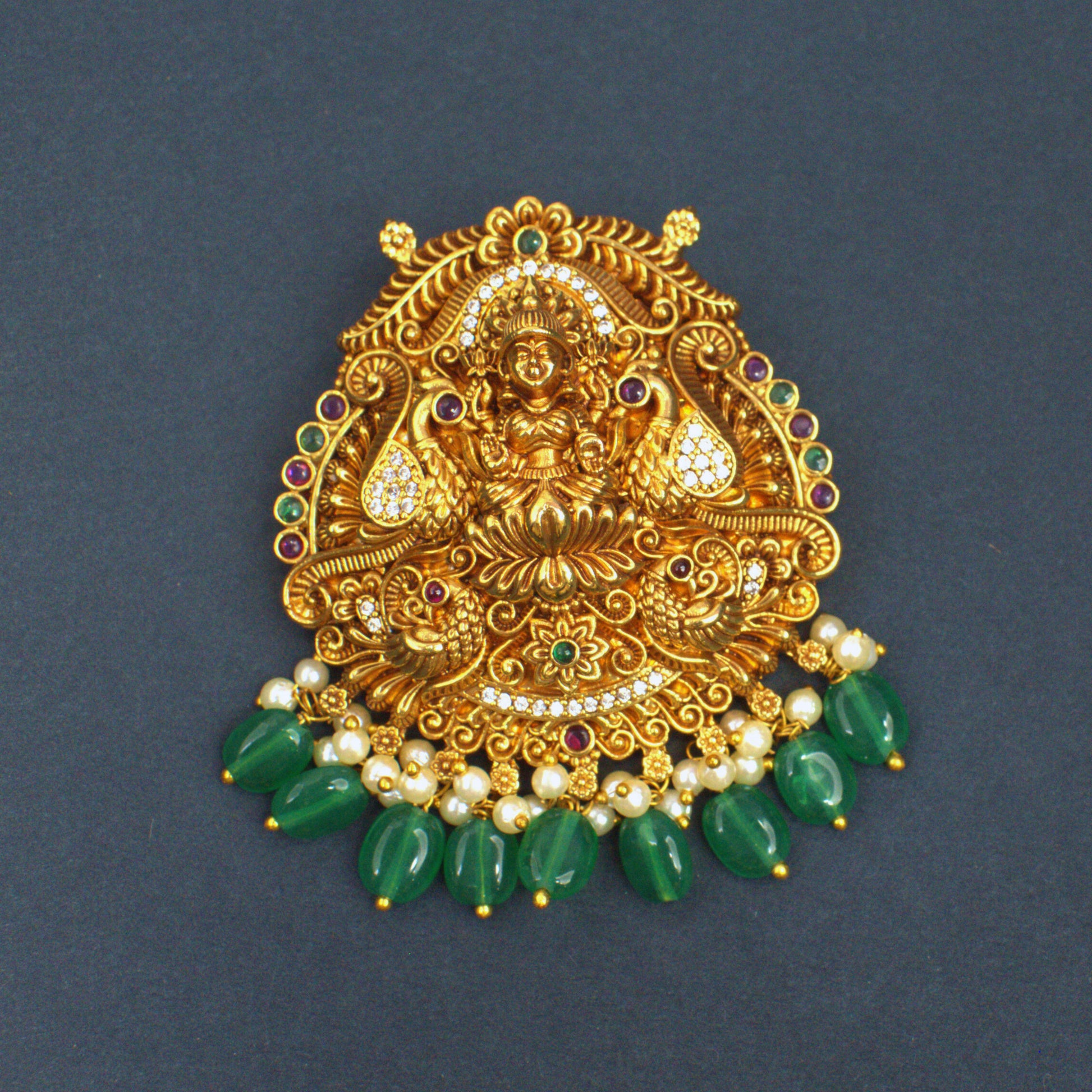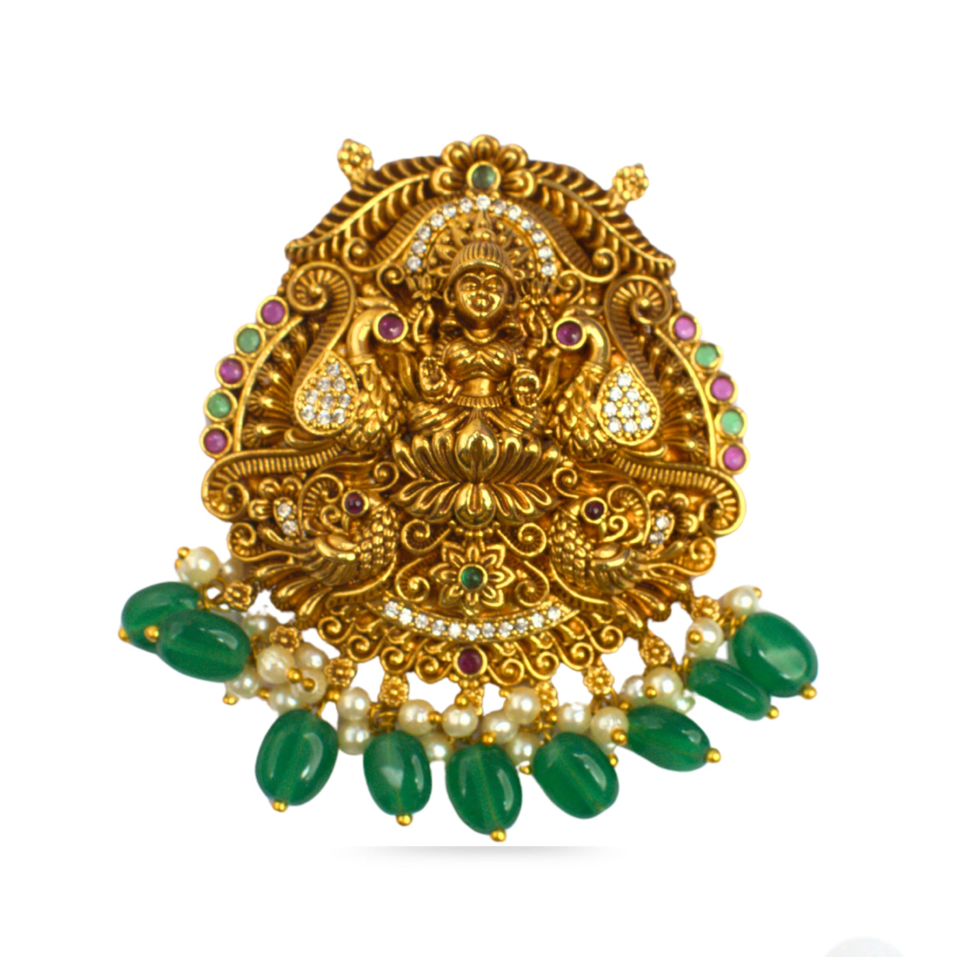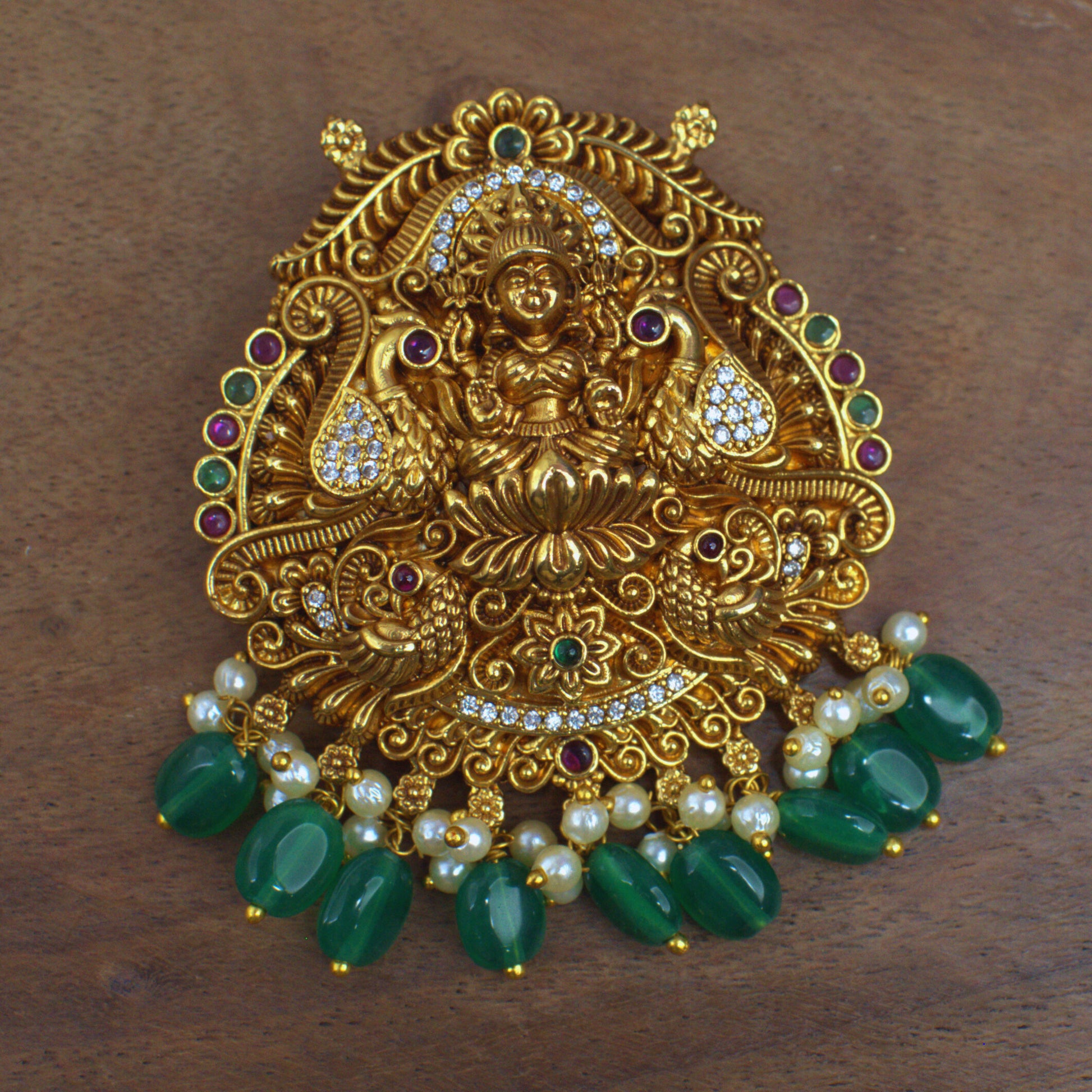 Nakshi Lakshmi Temple Pendant with Green Bead Drops & CZ Work