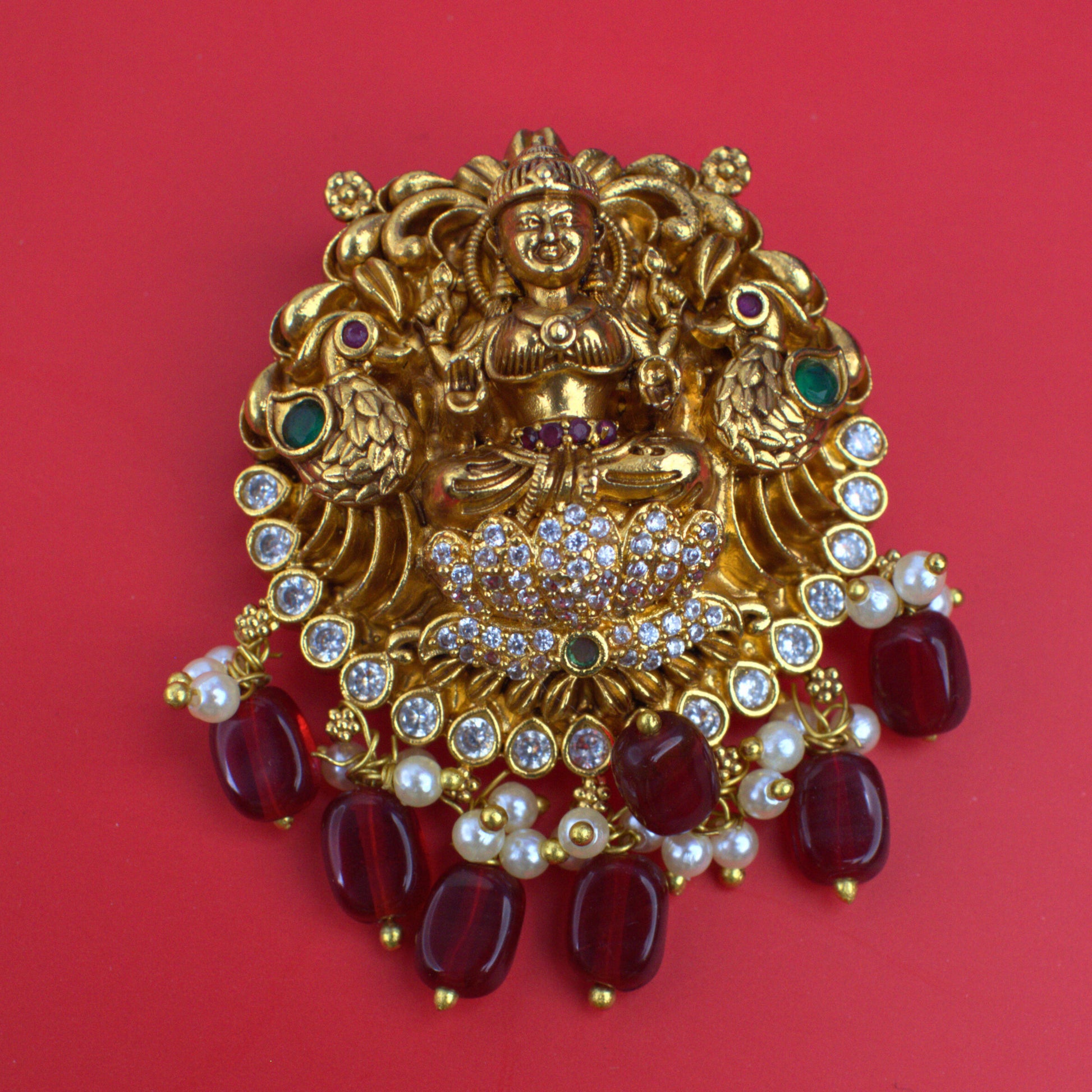 Udbhava Traditional Lakshmi Nakshi Pendant with Red Bead Drops – Temple Jewellery Design