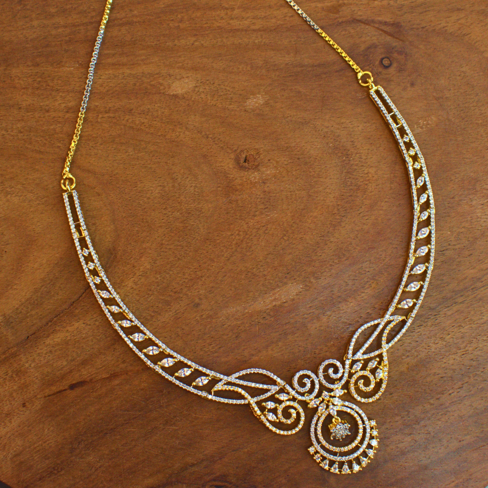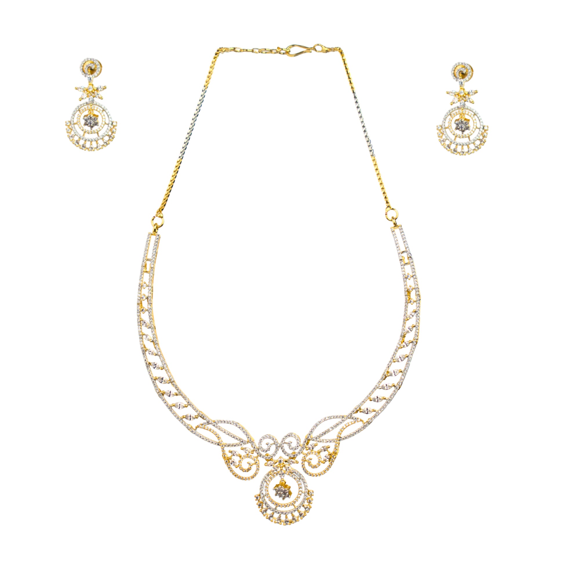 This elegant CZ necklace set from Udbhava features a refined dual-tone gold and silver finish, highlighted with sparkling cubic zirconia stones. Designed to offer a graceful balance of tradition and modern elegance, the necklace comes with matching drop earrings that enhance its overall appeal.