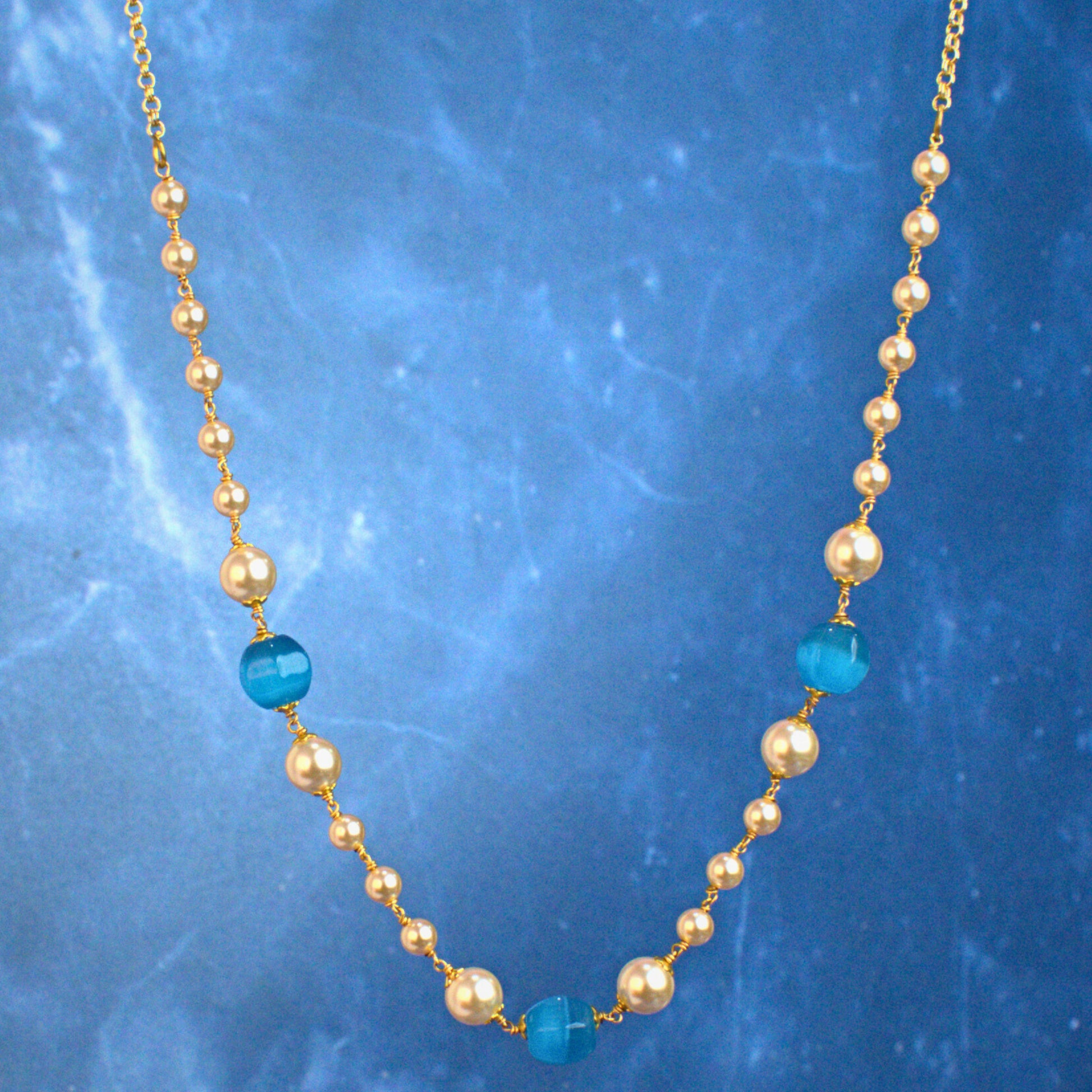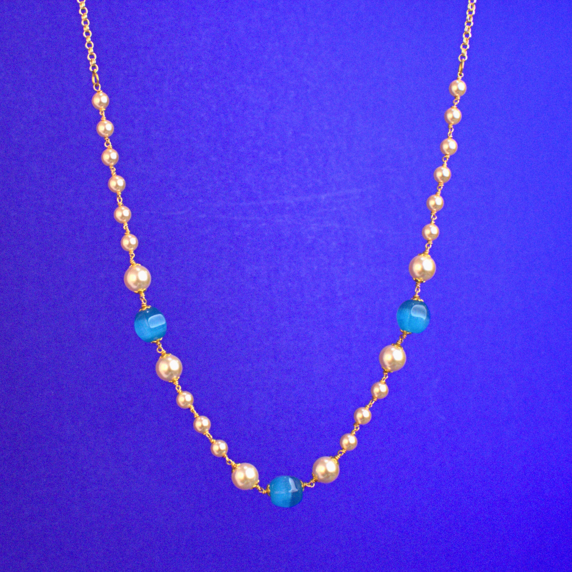 This handcrafted Kattu Theega necklace by Udbhava features a graceful combination of blue Monalisa beads and imitation pearls with gold plating. Lightweight and elegant, this necklace is ideal for daily ethnic wear, festive occasions and traditional styling. Comes with an adjustable chain for a comfortable fit.