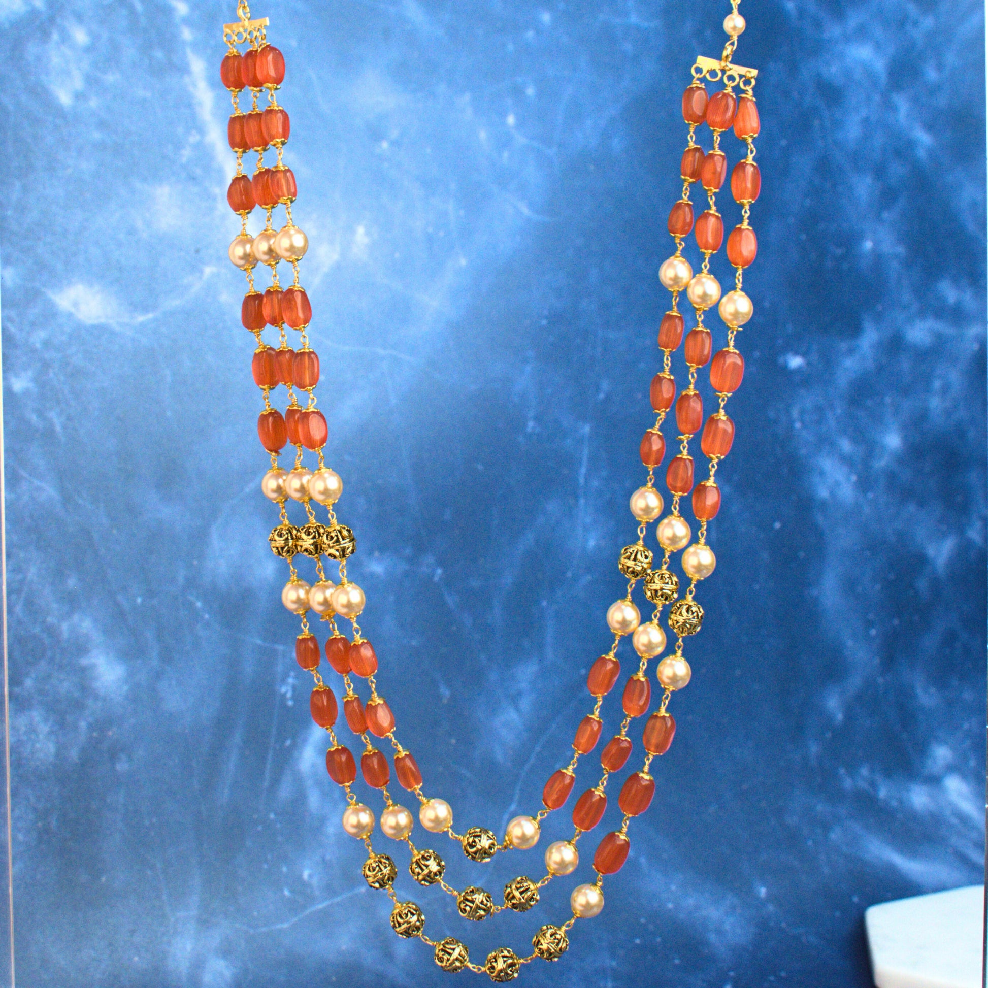 This handcrafted 3 line Kattu Theega necklace from Udbhava showcases a rich combination of red onyx beads, imitation pearls and intricately designed nakshi balls with gold plating. Designed for weddings, festive occasions and traditional ethnic wear, this necklace adds a regal touch while remaining comfortable with an adjustable chain closure.