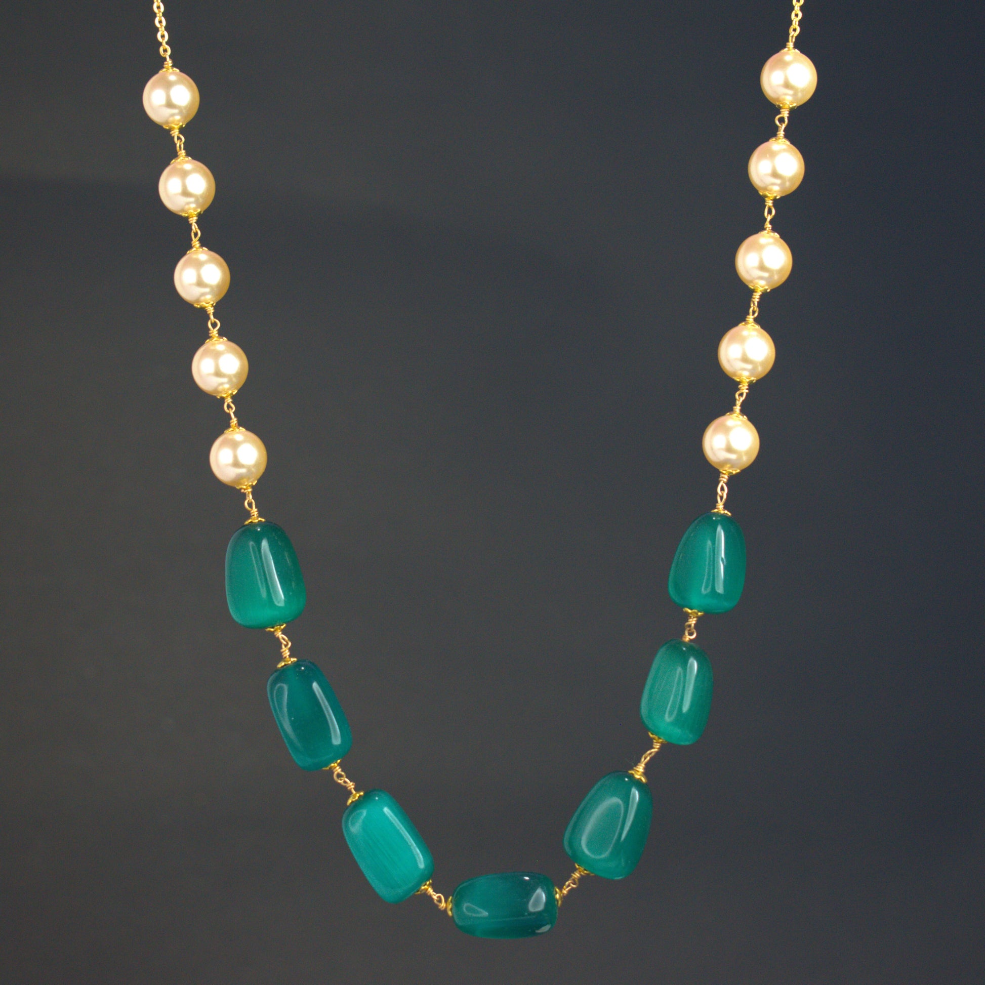 This single-layer Kattu Theega necklace is a timeless handcrafted piece inspired by classic South Indian aesthetics. Designed with a balanced arrangement of smooth beads and pearls, it offers a subtle yet elegant look that complements both traditional and contemporary ethnic wear.