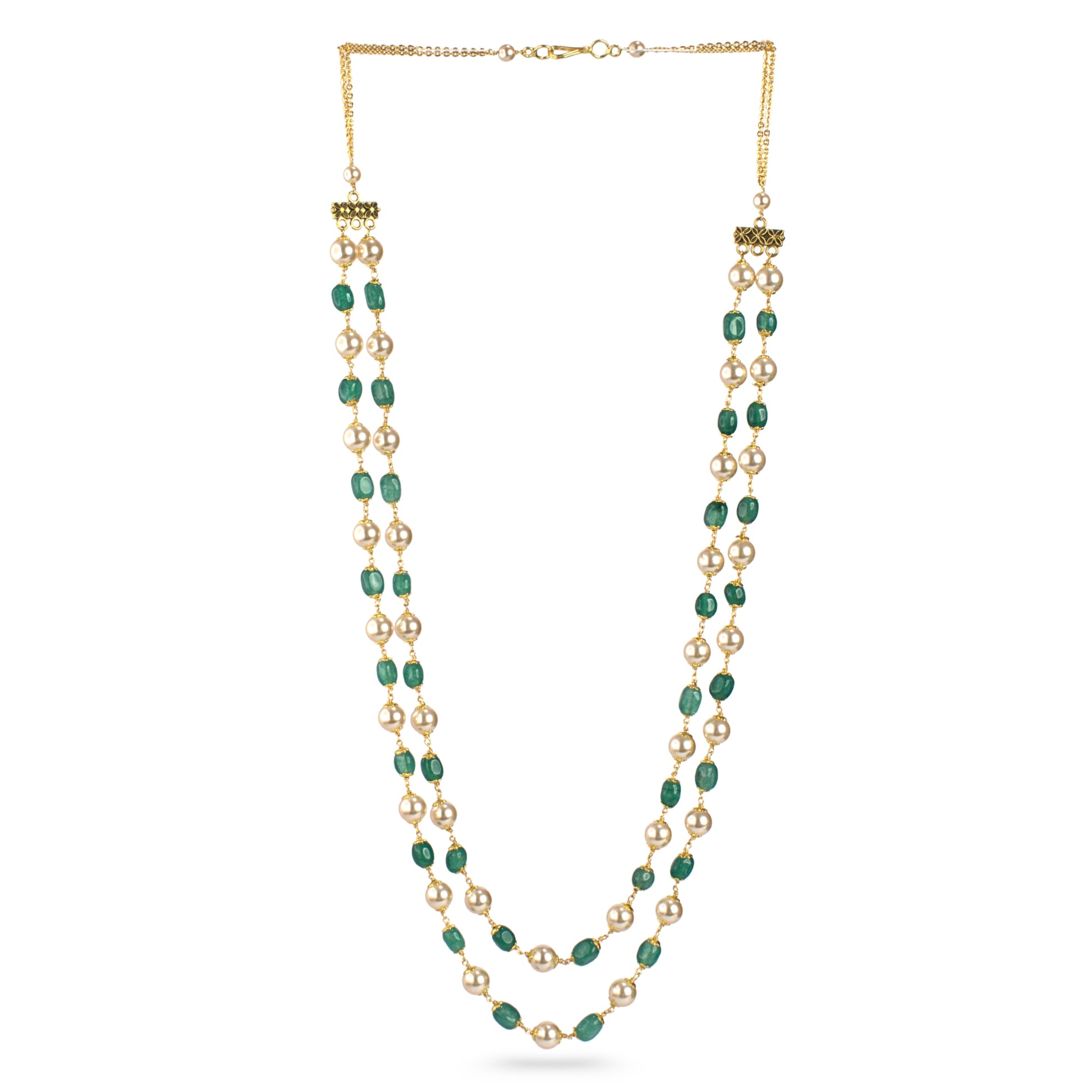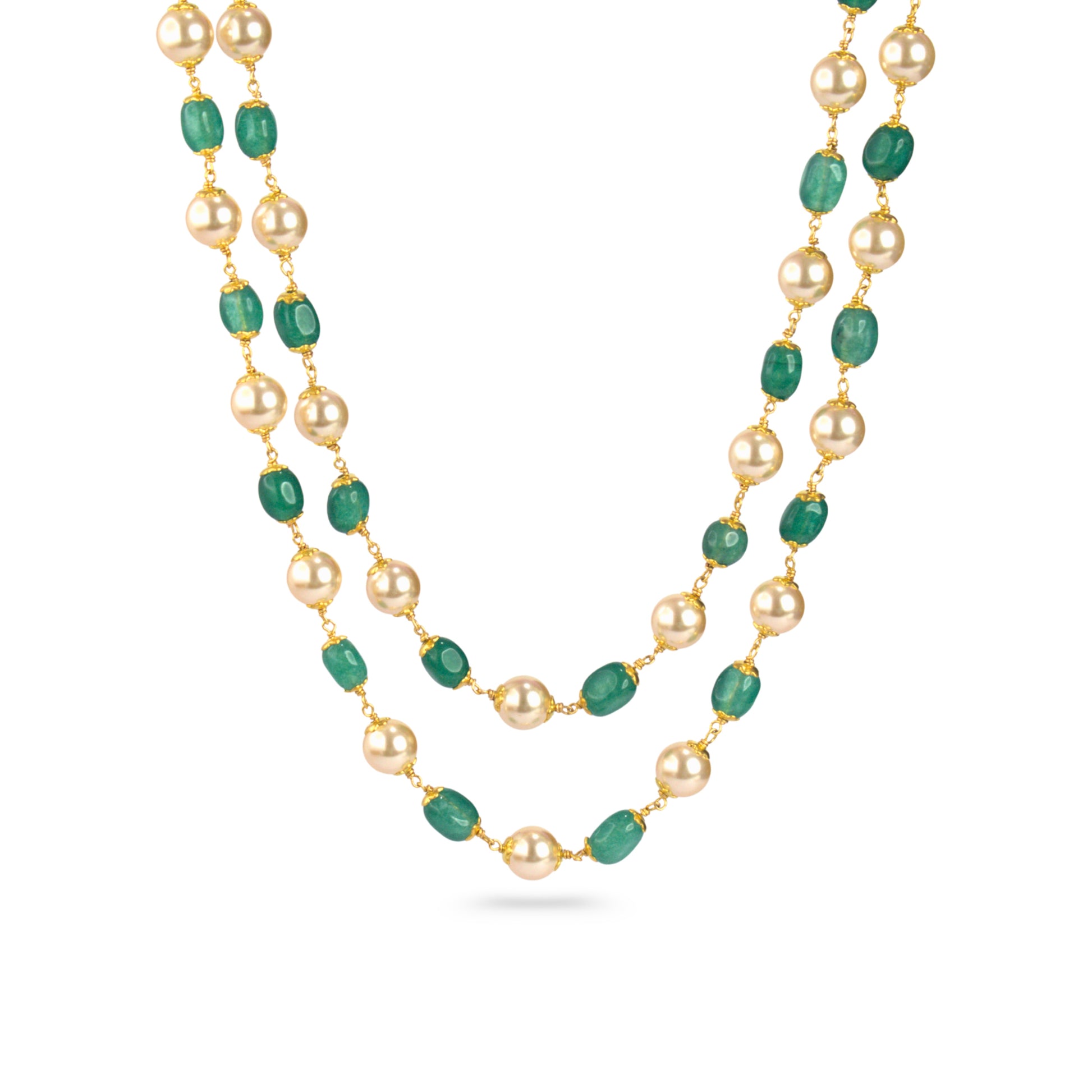 This two-layer Kattu Theega handcrafted necklace reflects timeless South Indian aesthetics with a balanced blend of pearl-finish beads and deep green accents. Designed to sit gracefully on the neckline, its layered structure adds depth and elegance without overpowering the look.