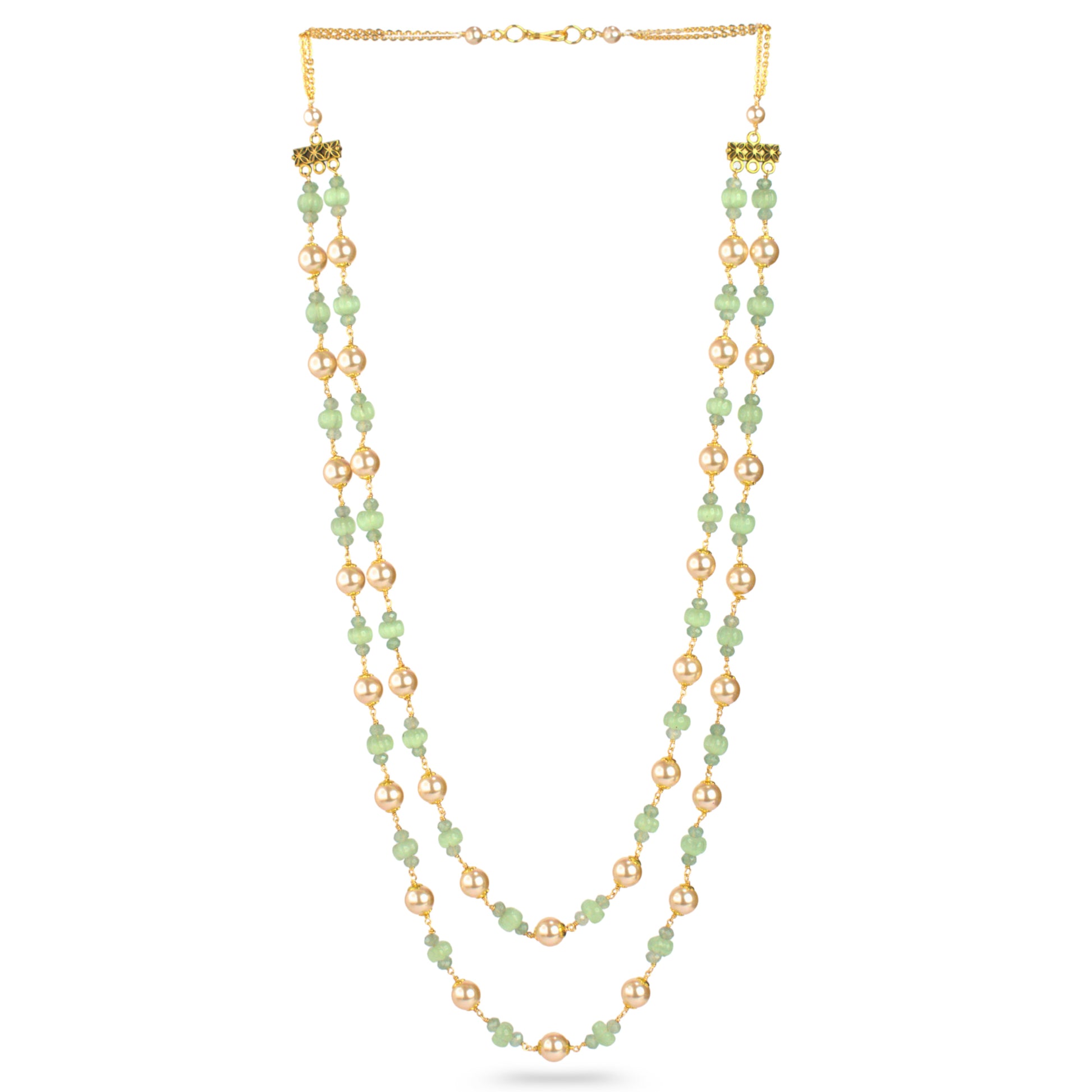 This two-layer Kattu Theega handcrafted necklace features a soothing combination of pastel green beads and pearl-finish accents, creating a refined and understated traditional look. The layered design adds depth while keeping the necklace light and wearable for long hours.