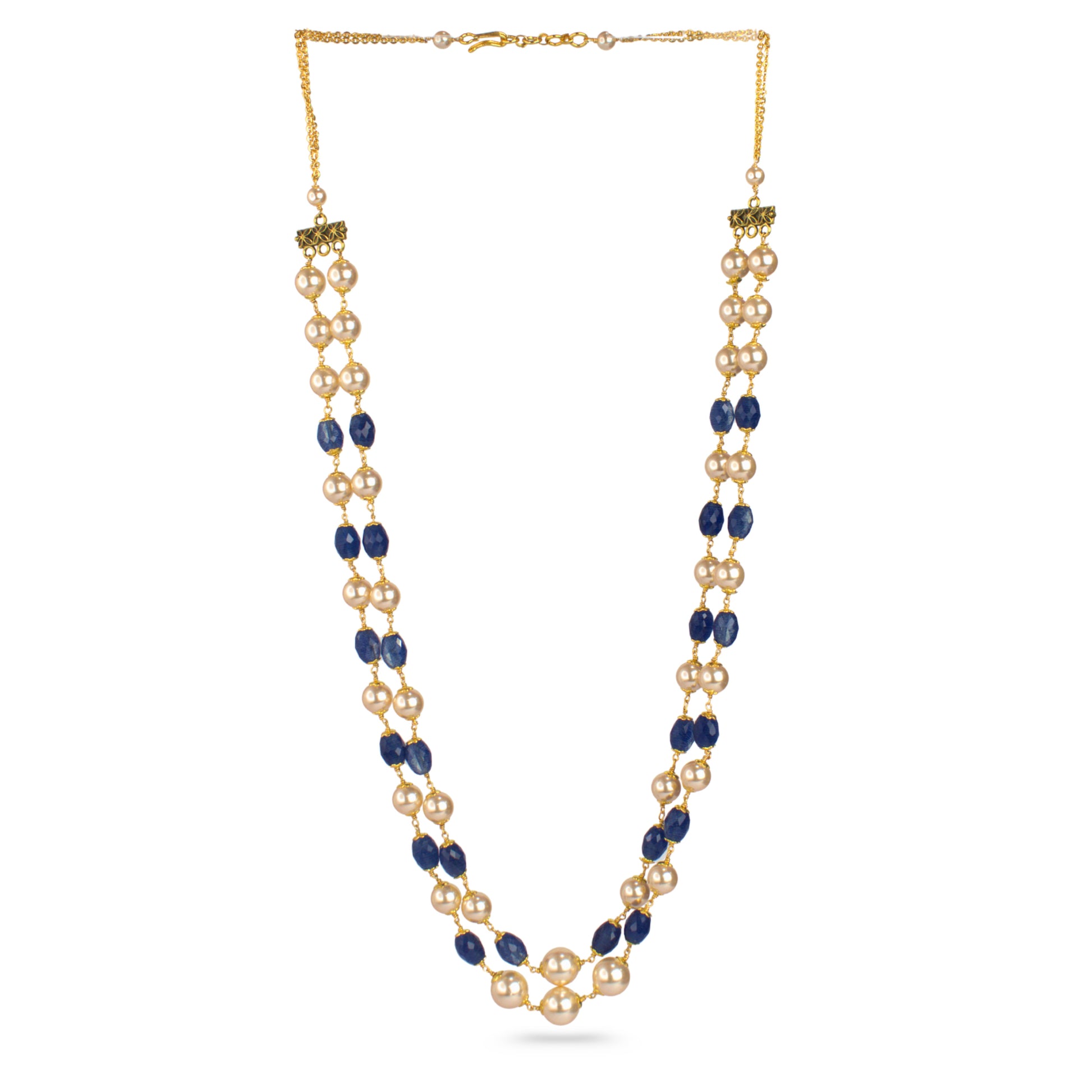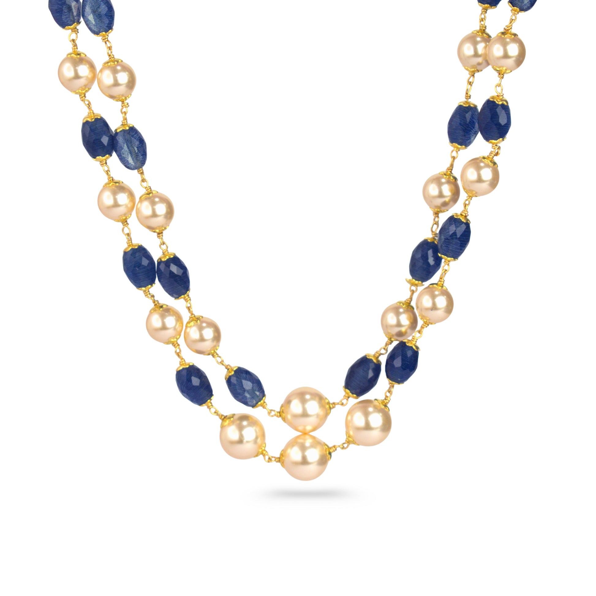 This two-layer Kattu Theega handcrafted necklace is designed with shimmering blue CZ beads paired with pearl-finish beads, creating a graceful and balanced traditional look. The layered structure adds depth and elegance while remaining light and easy to wear.